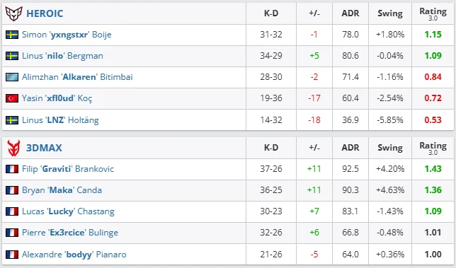On the second map, Heroic again tried to impose their game, but 3DMAX quickly seized control. Strong performances from bodyy and Lucky in key moments allowed the French side to close the match 13:9. Heroic looked disorganized: LNZ had a disastrous series (14-32, 0.53 rating), while xfl0ud (19-36, 0.72) became another weak link. Only Alkaren tried to create opportunities, but his individual efforts couldn’t save the team.
