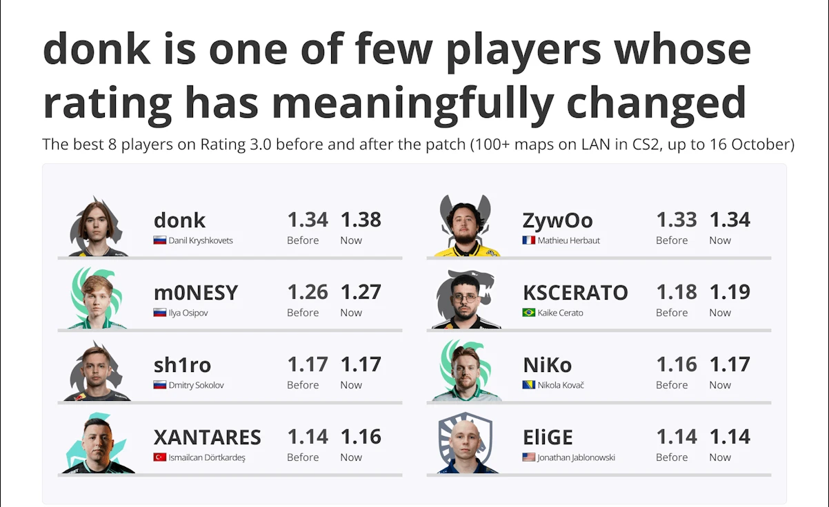 Valve’s latest economy patch changed round dynamics, so HLTV plans another adjustment once enough new data arrives. The aim remains the same — to create a single metric that accurately measures a player’s real impact.