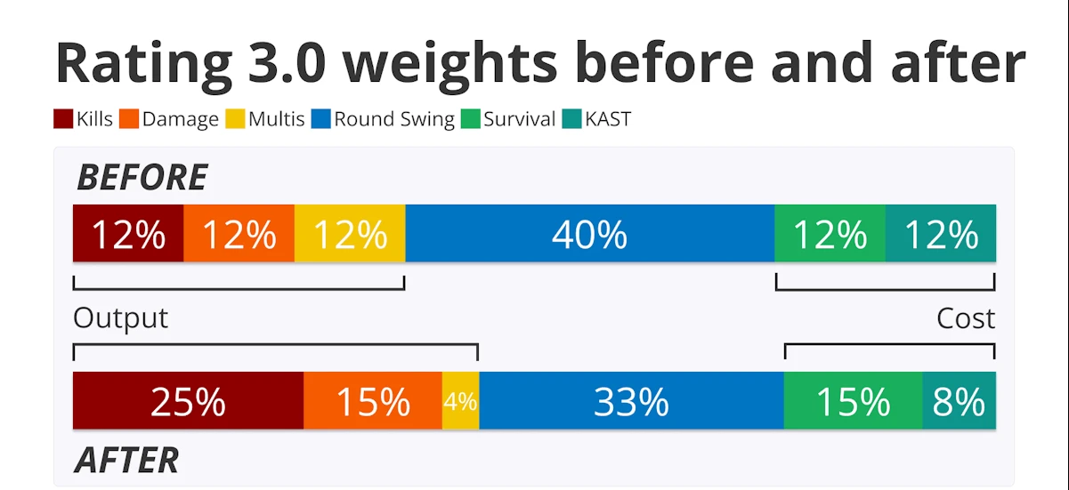 The key idea is simple — kills matter more again. After 3.0 launched, the Round Swing metric carried too much influence. HLTV reduced its weight so it now works as an impact modifier, not the main factor. Raw numbers like kills and damage once again define most of a player’s performance. Swing, KAST, and Multi-Kill ratings now act as supporting stats instead of decisive ones.