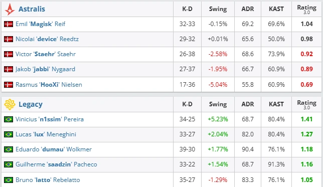 n1ssim emerged as the clear leader of the series. His consistency in duels and +5.23% swing made the difference on both maps. His confidence and tempo allowed Legacy to dictate the pace and impose their own style on Astralis.