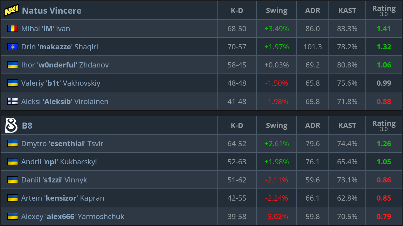 The most intense map of the series. B8 managed to impose a close contest and pushed the game into overtime. Despite being NaVi’s pick, it was B8 who showed more composure in the decisive rounds. - Dust2 (decider) — 13:7