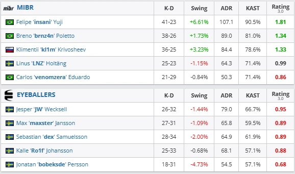 The second map followed a similar pattern, though EYEBALLERS showed slightly more resistance. They managed to win a few key rounds early on, but every time they started building momentum, MIBR shut it down. Superior coordination and better trading in mid-round situations allowed the Brazilian side to stay in control. Closing the map 13:9, MIBR secured a clean 2–0 victory and a well-deserved playoff spot.