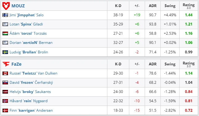 For FaZe, the standout player was Russel “Twistzz” Van Dulken (29–30, Rating 1.14), while karrigan and rain struggled to maintain their usual tempo.