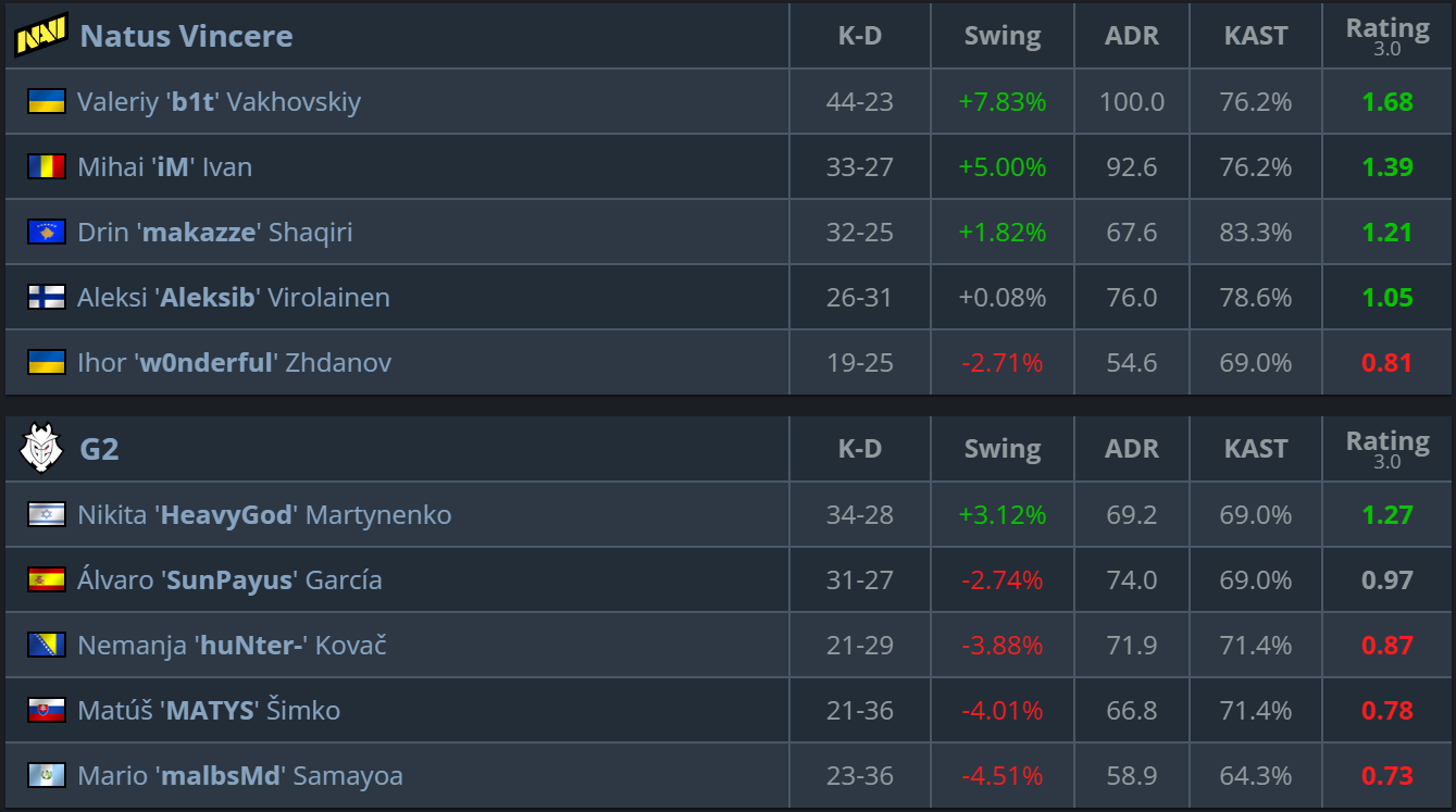 On their own selection, NAVI displayed greater macro stability, managing mid-round scenarios effectively and limiting G2’s rotational freedom. The European side found isolated successes but failed to recover the series.