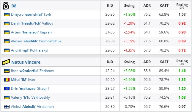 B8 failed to impose their tempo from the very first round: NAVI immediately seized control of mid and A-long, forcing B8 into reactive play for the entire half. NAVI’s defense read every approach before it even developed, while their attacks opened sites effortlessly thanks to consistent duels won by w0nderful and makazze.