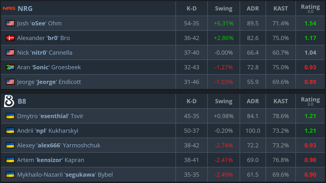 NRG responded as decisively as possible. Full map control, aggressive mid work from oSee and Sonic, and total superiority in retakes. B8 were given almost no space to set up their plays, and their economy collapsed already in the first half. The map became a one-sided domination by NRG.