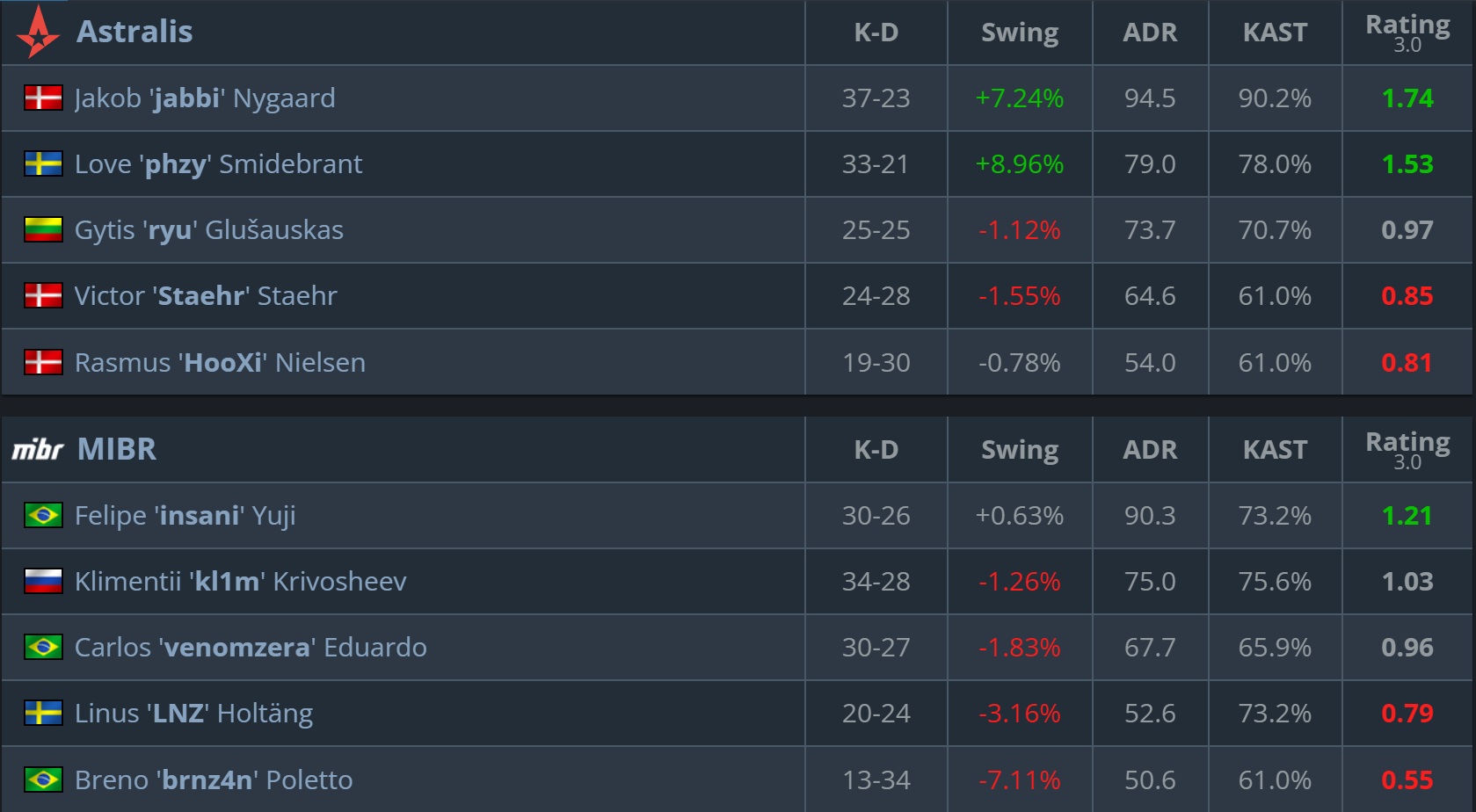 Astralis opened the series with a win on the opponent’s pick. MIBR kept the match within a competitive scoreline, but the Danish roster navigated the key stretches of the map better and punished the opponent’s mistakes more consistently. - Overpass (Astralis’ pick) — 13:5