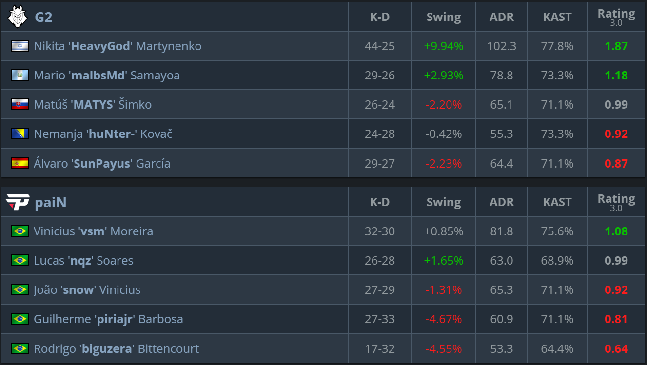 G2 delivered a structured performance, controlling key areas and managing the economy effectively. paiN stayed competitive through individual plays, but the European side proved more stable in decisive rounds. - Mirage (G2 pick) — 13:9