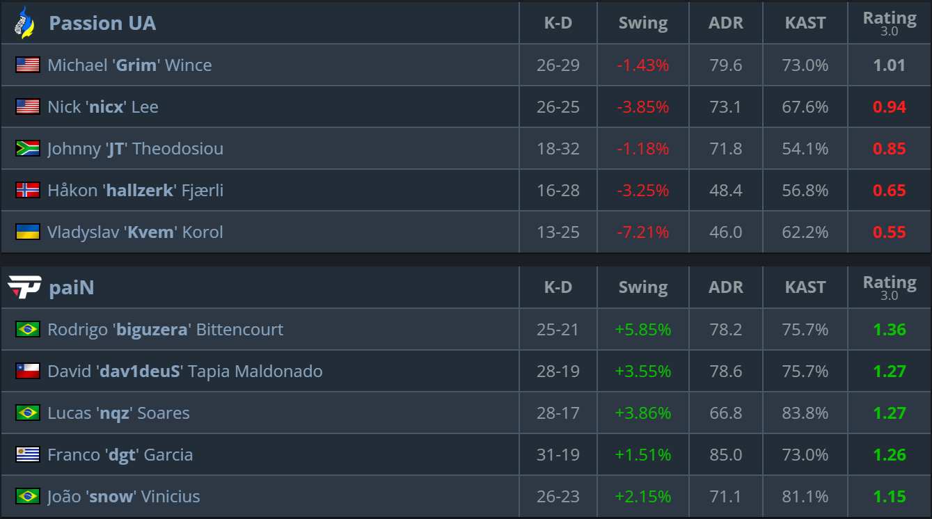 The Brazilians took control from the opening rounds: biguzera and dav1deuS dominated the duels, while Passion UA were unable to find an effective way to break through their defensive setups.
