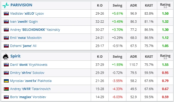 Despite the loss, Danil “donk” Kryshkovets stood out individually with a 1.55 rating and 110+ ADR across the series. However, his impact wasn’t enough to compensate for the overall struggles of the team. On the winning side, PARIVISION showcased a complete team effort, with multiple players stepping up and maintaining high consistency throughout both maps — a key factor behind their dominant win.