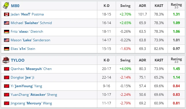 M80 corrected their early mistakes and looked far more cohesive on Train. Slow, methodical rounds, precise timing on executes, and strong late-round decisions allowed them to secure eight T-side rounds — the foundation of their victory. TYLOO tried to break the game open with individual aggression, but it lacked coordination: too many pointless duels, poor trading, and even a strong performance from Moseyuh couldn’t save the map.
