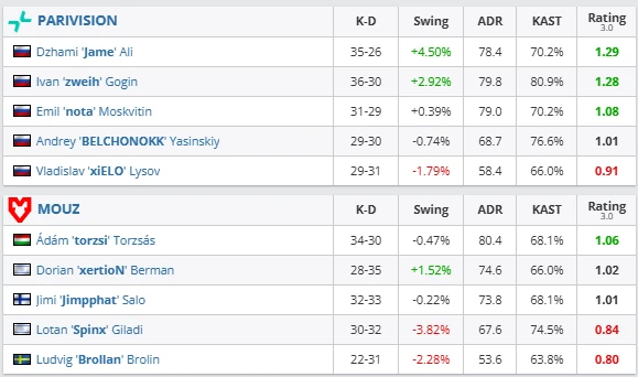 Inferno showcased PARIVISION’s structure at its best. Their CT setups disrupted MOUZ’s early map control, forcing awkward executes and limiting lurk value. Jame once again led from the front, finishing the series with. Zweih (1.28 rating) and nota provided consistent support, while BELCHONOK delivered key anchor holds in late rounds.