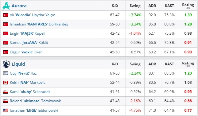Aurora came back from behind to defeat Team Liquid 2–1 (16–19 on Mirage, 13–4 on Train, 13–8 on Dust2). The match showcased the squad’s adaptability and strong fundamentals. Wicadia (1.39) and XANTARES (1.28) were unstoppable, delivering key entries and dominating duels on Train. Their aggressive but calculated playstyle left Liquid with little room to recover. Liquid showed resilience through NertZ (1.23) and NAF (1.03), yet their CT sides crumbled under Aurora’s relentless pressure.