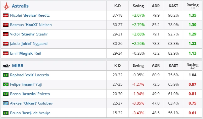 Astralis continued their resurgence with a convincing 2–0 win over MIBR (13–4 Inferno, 13–11 Nuke). The Danes dominated early rounds with near-flawless coordination and strategic depth. device (1.35), HooXi (1.30), and Staehr (1.29) led the scoreboard, showing that the team’s rebuild is starting to pay off. MIBR, despite a promising start on Nuke, failed to convert key clutch situations. exit (1.04) was their best performer, but the lack of follow-up fragging proved costly.