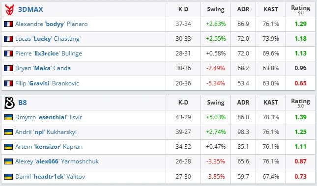 B8 closed the day with an impressive 2–0 victory over 3DMAX (13–11 Ancient, 13–9 Inferno). The Ukrainian squad looked confident, combining sharp aim with strong discipline. esential was unstoppable, scoring 43 kills and a 1.39 rating, while npl (1.25) and kensizor (1.11) followed closely behind. Their synergy and defensive stability made the difference. 3DMAX failed to repeat their previous performances, struggling with retakes and losing crucial mid-round duels. bodyy (1.29) tried to carry the team but lacked support.