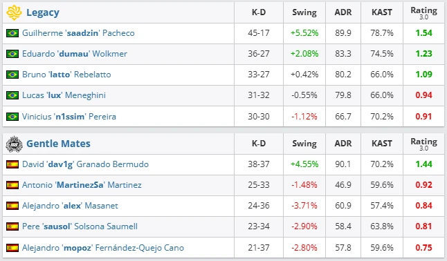 Guilherme “saadszin” Pacheco was the key difference. He scored 45 kills and achieved a 1.54 rating, dominating both maps. Teammates dumau (1.23) and latto (1.09) supported perfectly, helping the team maintain rhythm and economy. Although Gentle Mates fought back on Inferno, they couldn’t stop Legacy’s confident mid-round executions.