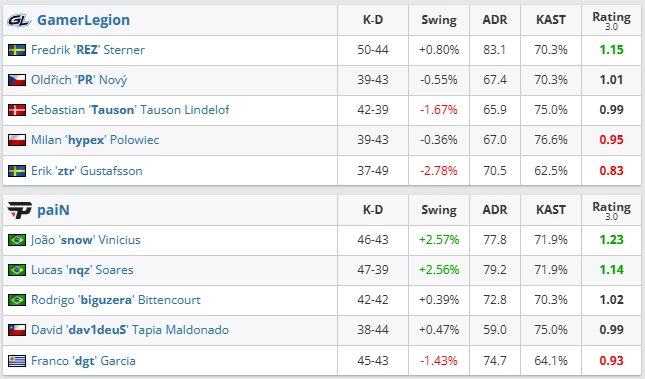 João “snow” Vinicius (1.23) and Lucas “nqz” Soares (1.14) led paiN’s recovery with excellent opening duels and clutch play. Captain biguZera again proved vital — his perfect timing on Dust2’s retakes turned the match around. Despite strong performances from REZ and PR, GamerLegion failed to adapt to paiN’s aggressive tempo.
