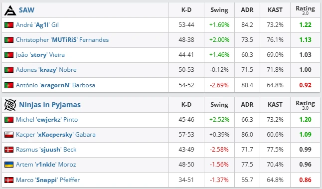 The Portuguese roster showed maturity under pressure. Ag1l (1.22) and MUTiRiS (1.13) secured critical trades, while story closed the final round with an AWP clutch in overtime. NiP played better than in their previous match, but once again faltered in key moments. ewjerkz (1.20) and xKapersky (1.09) pushed hard, though SAW’s composure earned them a long-awaited win.