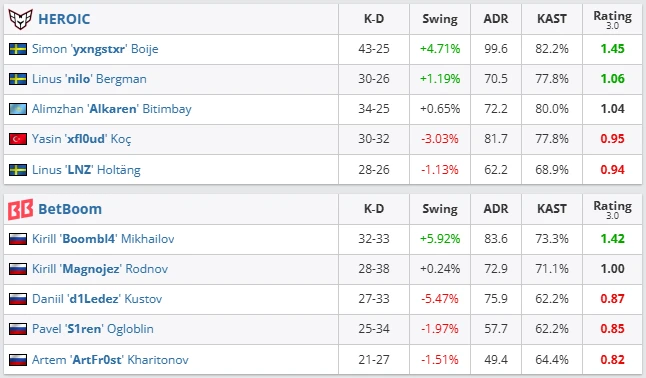 After a rocky start to the event, the Danes and Swedes are regaining their identity. Simon “yxngstxr” Boije was outstanding with 43 kills, a 1.45 rating, and 82% KAST. He was backed by nilo (1.06) and Alkaren (1.04), who held sites with discipline and composure. BetBoom’s star Boombl4 (1.42) fought hard but couldn’t prevent the defeat. His teammates struggled to coordinate utility and lost momentum early on.