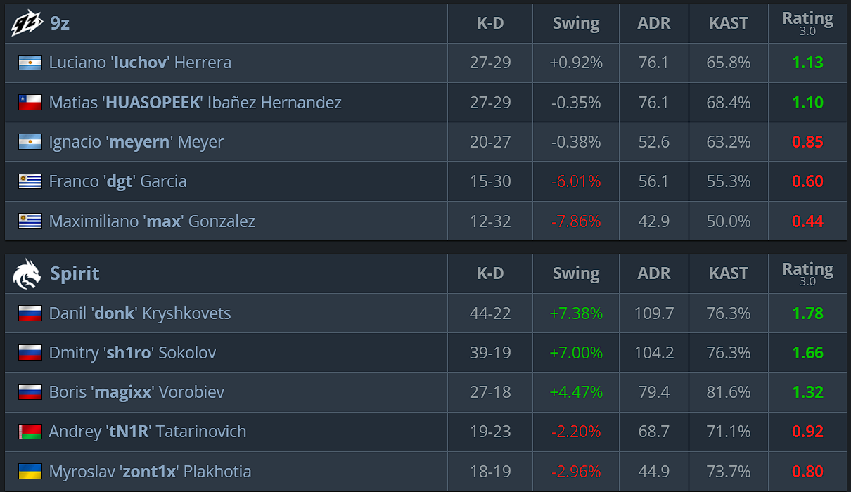 Spirit delivered a fully controlled series and did not allow 9z to establish a competitive fight either on their own pick or on the opponent’s map. The key difference was superior individual skill, more consistent execution in decisive rounds, and complete control of the game’s tempo. Donk was the central figure of the match and helped Spirit close out the series 2:0 without complications. As a result, Spirit advance to the lower final, while 9z are eliminated from the tournament.