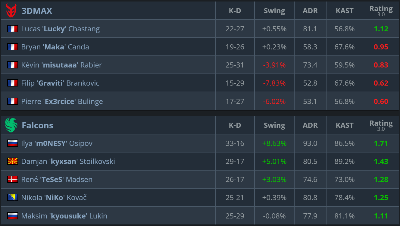 The victory gives Falcons a powerful VRS increase and a very confident start in the Group A upper bracket. - 3DMAX — -6 pt → 1596 pt