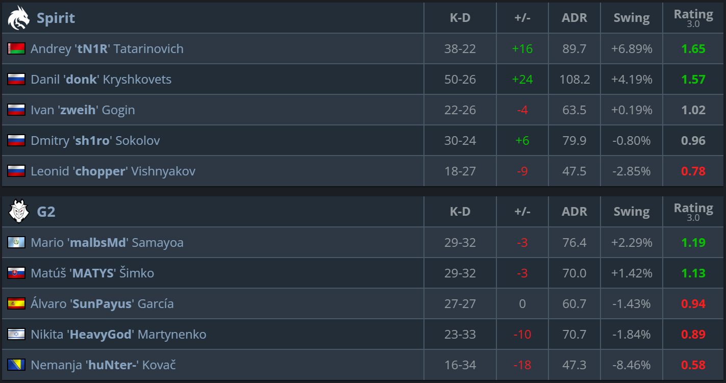 From the opening rounds, Spirit took control of the map. G2 tried to recover after a weak start, but key clutch rounds from donk and tN1R solidified Spirit’s advantage.