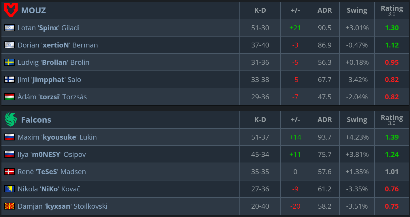 Falcons started the series confidently, building a comfortable lead on the attacking side. m0NESY and kyousuke dominated key rounds, preventing MOUZ from imposing their playstyle.
