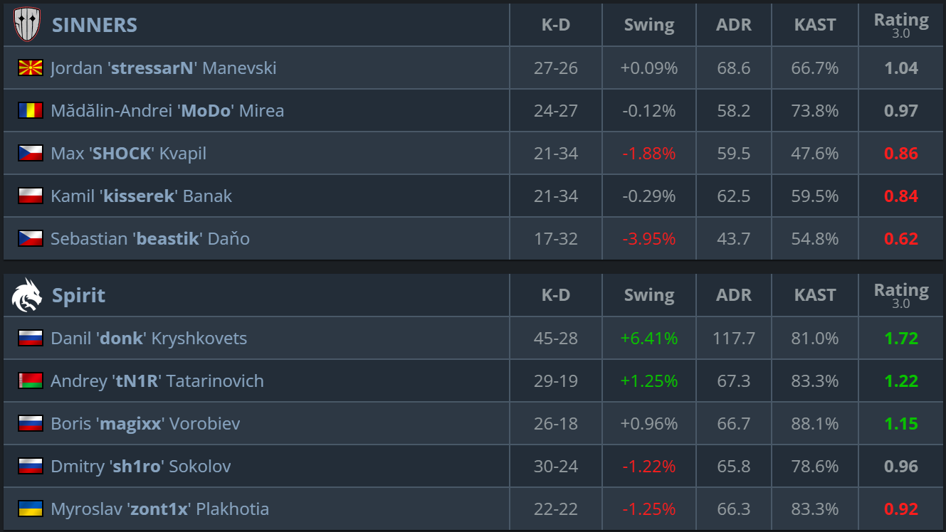 SINNERS unexpectedly put up a fight on the first map. They held on thanks to aggressive pushes and solid individual decisions from stressarN and SHOCK. However, Spirit worked better in the late rounds, read rotations more consistently, and won all the key clutch rounds. Experience and composure were exactly what made the difference on the scoreboard.