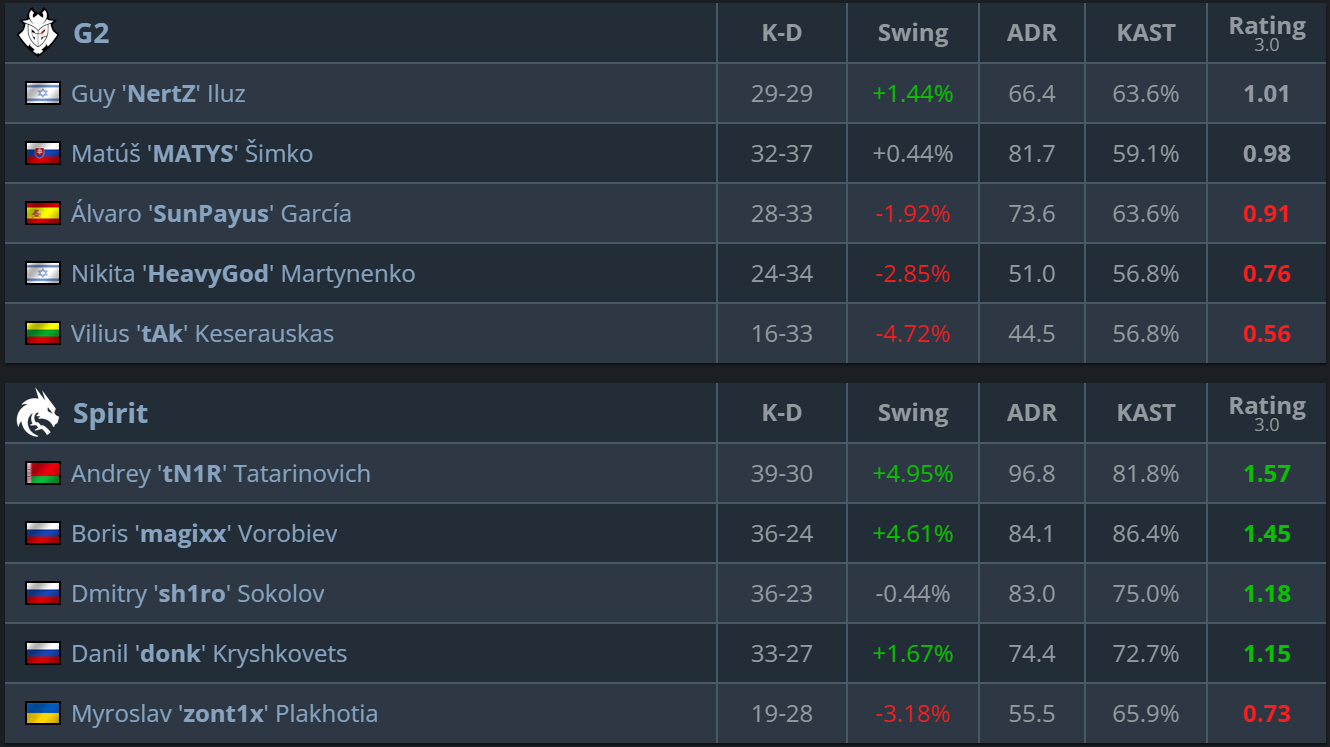 On their own choice, Spirit played a much closer match. G2 stayed closer to their opponent and tried to bring suspense back into the series, but in the key rounds Spirit proved more stable and closed out the map without a decider.