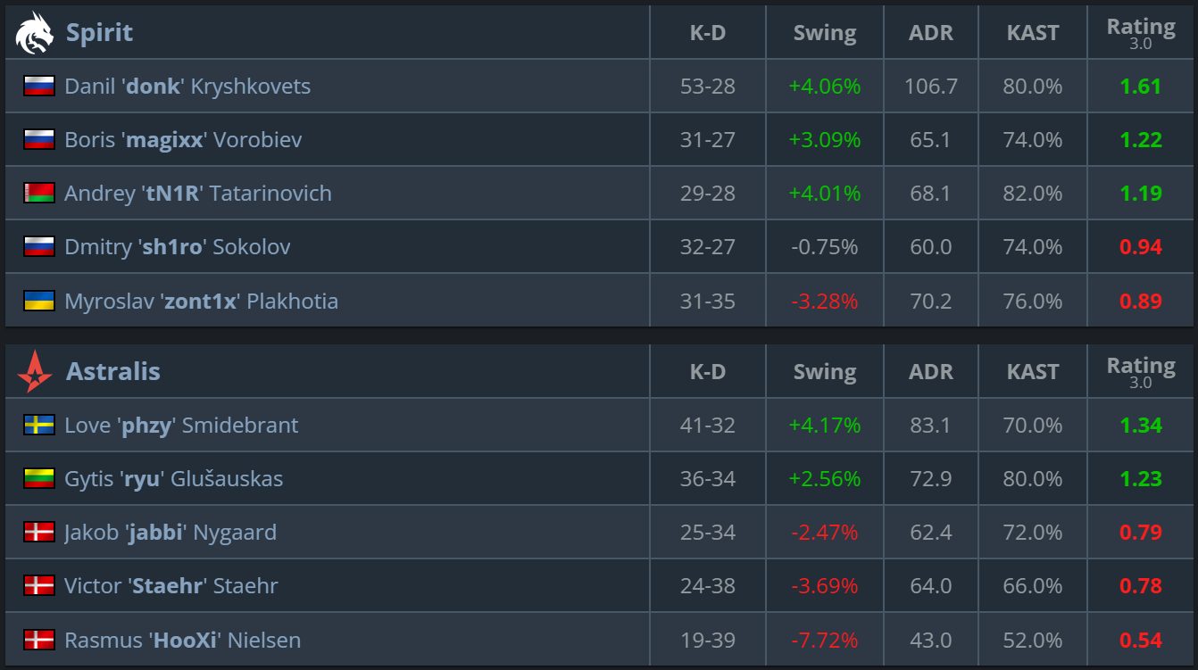 On the Danes’ pick, Spirit looked even more convincing. They read timings better, punished aggression decisively, and quickly seized the initiative after winning several early rounds. Astralis could not find consistent answers on the attacking side, and the map ended without a real chance of a comeback.