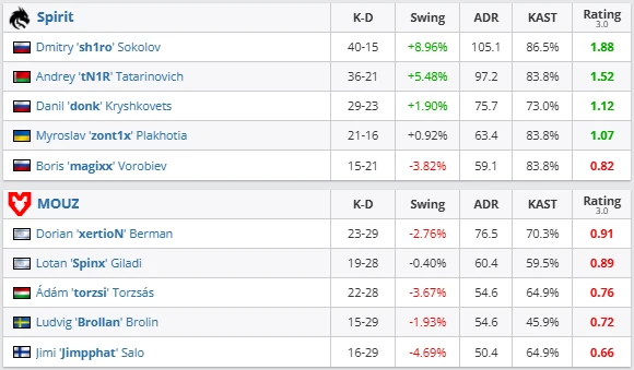 If Dust2 still offered some hope for MOUZ, Mirage was a cold shower. Spirit won most of the opening duels, crushed the economy, and effectively decided the map in the first half. tN1R and donk repeatedly found openings for aggression, while MOUZ looked disoriented, unable to respond to Spirit’s pace and structure. The map ended quickly and without intrigue.