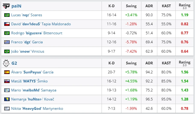 G2 delivered one of their cleanest Dust2 performances of the tournament. They controlled the match from the early rounds, executed disciplined defense, and denied paiN any rhythm. SunPayus dictated the pace with flawless AWP work and sharp mid-round impact. PaiN attempted long and mid-pressure, but G2 consistently adapted and closed out the map with composure.