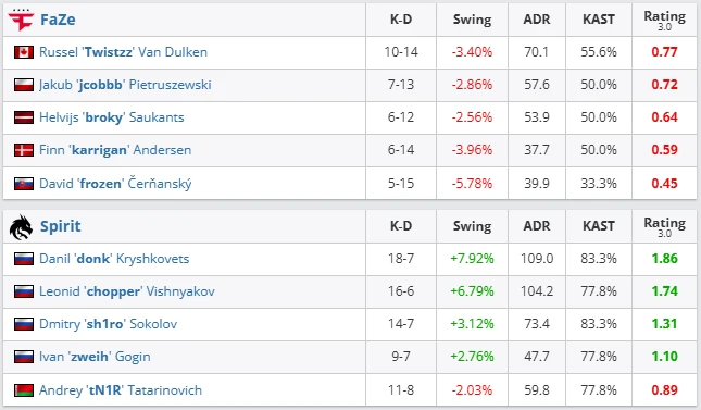 This match was a reminder: when Spirit find their form, they are nearly unstoppable. Donk produced another monster performance — relentless aggression, consistent multikills, and an AWP ACE that shattered FaZe’s confidence. FaZe looked disconnected, lost most duels, and their attacks collapsed against Spirit’s perfect coordination.