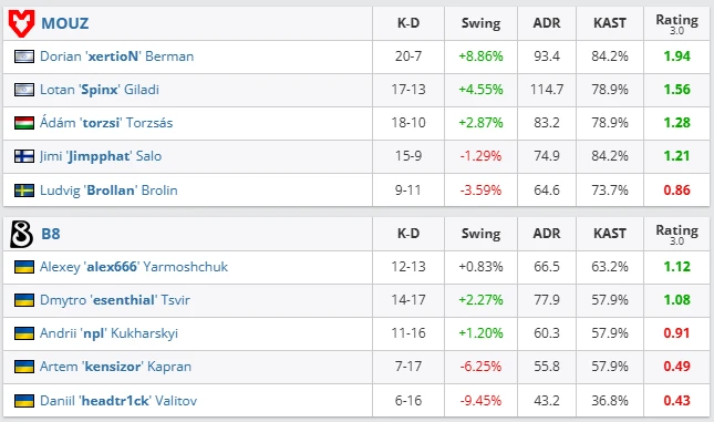 MOUZ handled B8 confidently, showcasing strategic discipline and structured defense. XertioN played like a true leader — explosive entries, excellent accuracy, and high-impact frags in clutch retake situations. B8 started well but gradually lost tempo as their T-side structures collapsed under pressure.