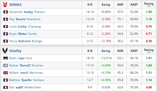 Vitality responded to all doubts with an overwhelming display. 3DMAX couldn’t find a single weakness in their defense, while ropz produced a near-perfect map — elite positioning, efficient rotations, and high ADR across all rounds.