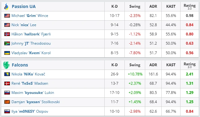 Falcons delivered one of the most stable matches of the stage. NiKo demolished duel after duel, and the team operated like a well-tuned machine. The 10–2 first half erased any doubt about the outcome. Passion UA fought hard but consistently lost individual fights, especially on the A site.