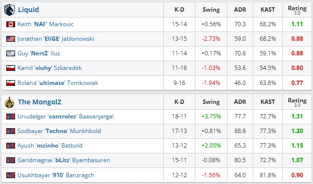 The closest match of the evening. Liquid started strong, but MongolZ regained control through mid aggression and clinical retakes. Controlez produced crucial multikills, including a momentum-shifting ACE. Liquid controlled portions of the map but lacked discipline in critical rounds.