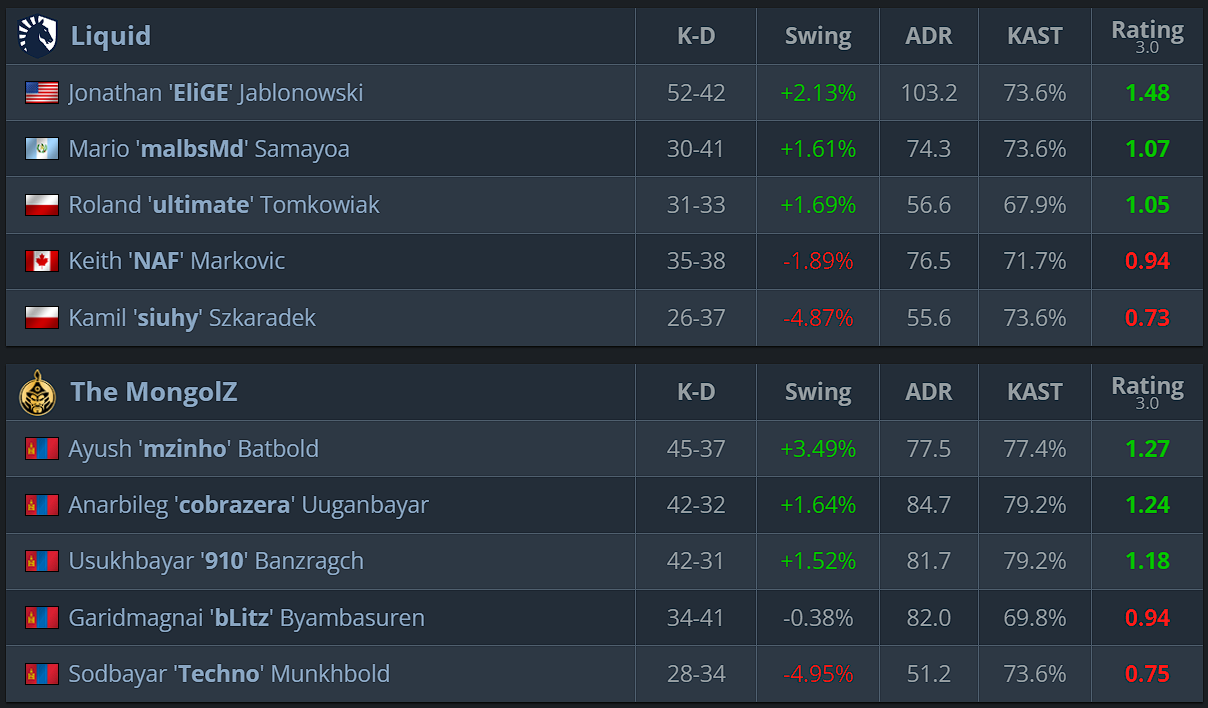 Liquid were very close to converting their own map pick, but The MongolZ held under pressure and closed out the map in overtime. The Mongolian squad’s ability to perform better in decisive rounds became the key to their early lead in the series. - Mirage (pick The MongolZ) — 13:10
