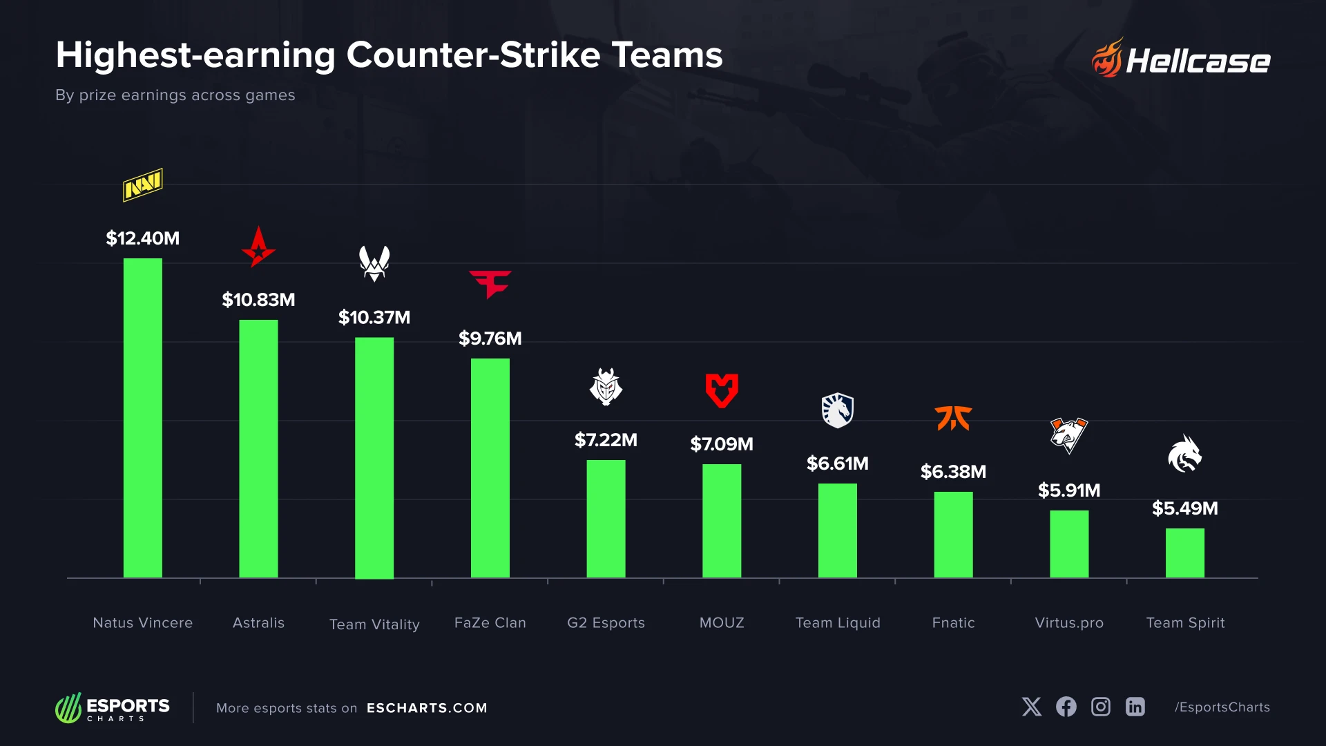 Ukrainian organization Natus Vincere tops the all-time ranking with $12.40 million in Counter-Strike prize winnings. NAVI have remained one of the biggest brands in the scene for years, with their most iconic period being the dominant 2021 season.