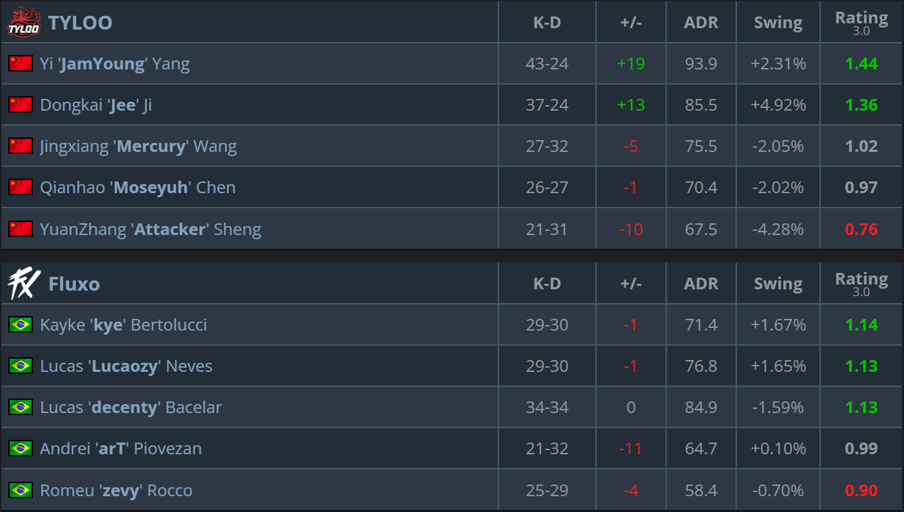 Chinese team TYLOO (#15 in the world) defeated Fluxo (#42) in an incredible thriller that ended 22 : 20 on Train after double overtime. The match turned into a true showcase for Yi “JamYoung” Yang, who achieved a Rating 3.0 — 1.44, scored 43 kills (+19), and had ADR 93.9. His duo with Jee held the defense strong, and the decisive moment came in the second overtime, when TYLOO stopped the Brazilians’ push toward the B site.