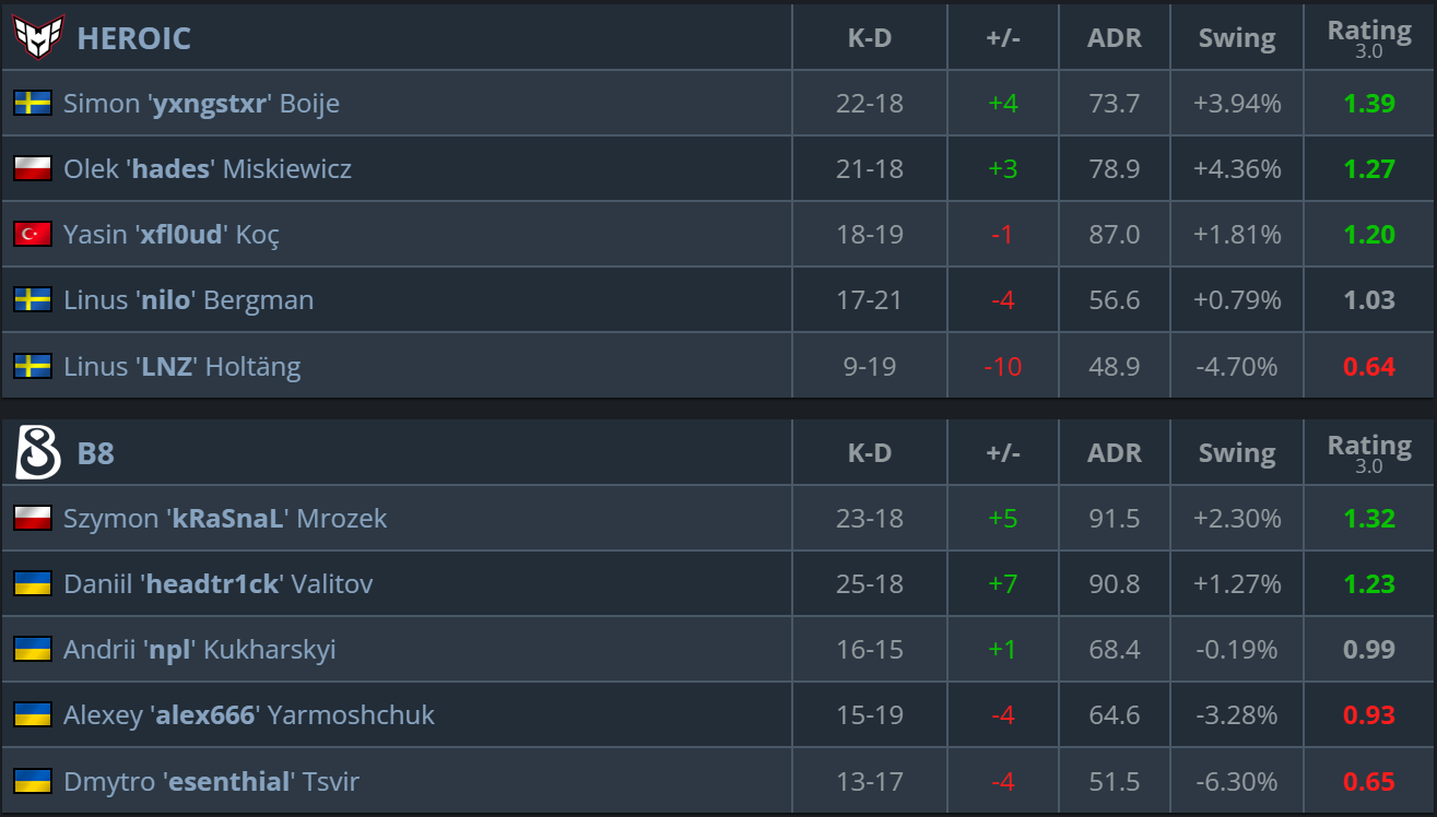 The match between HEROIC (#21) and B8 (#22) ended with a victory for the Danish-Polish HEROIC roster — 16 : 12 on Dust2. The key player was Olek “hades” Miskiewicz, who achieved a Rating 3.0 — 1.27, ADR 78.9, and 21 kills. The team showed consistent performance, securing several crucial clutch rounds in the second half.
