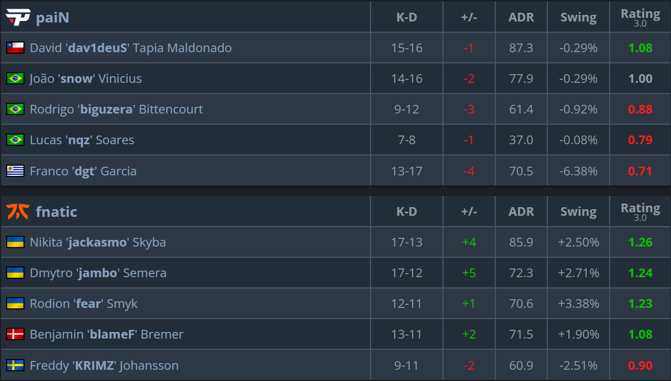 European fnatic (#27) confidently defeated paiN (#14) with a score of 13 : 8 on Overpass. The best performer was Nikita “jackasmo” Skyba, who recorded a Rating 3.0 — 1.26, ADR 85.9, and 17 kills. blameF’s team controlled the game from the first rounds, especially on the CT side (7 : 5 in the first half).