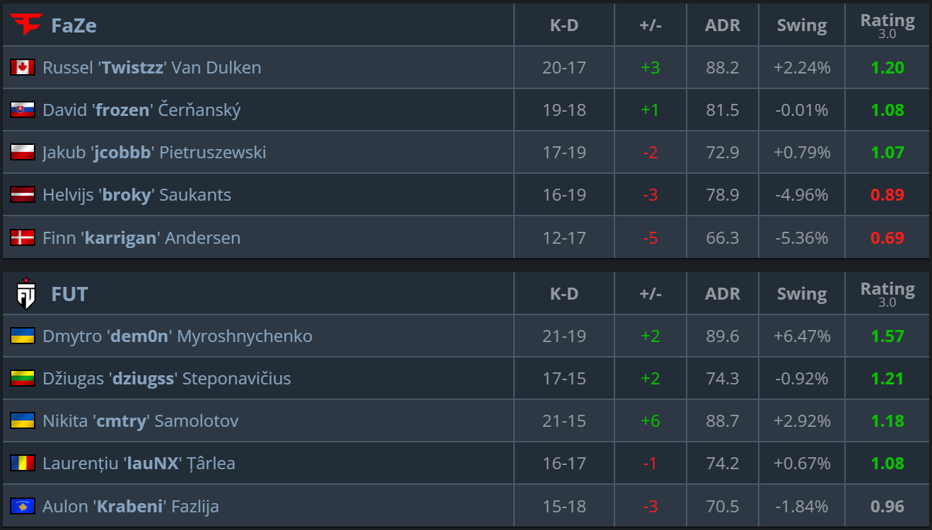 One of the biggest surprises in Group B was FaZe Clan’s (#11) defeat against Turkish FUT Esports (#49) — 11 : 13 on Mirage. The young Dmytro “dem0n” Myroshnychenko became the hero of the match with a Rating 1.57 and ADR 89.6. His steady play in mid and decisive clutches in the second half broke FaZe, who lost six consecutive rounds on the CT side.