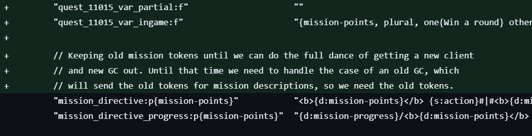In developer comments, it is explicitly stated that old mission tokens are intentionally kept until Valve can fully transition to a new client and a new game coordinator. Until that moment, the game is forced to support the old coordinator, which continues to send outdated tokens for mission descriptions — that is why they are not being removed from the files yet.