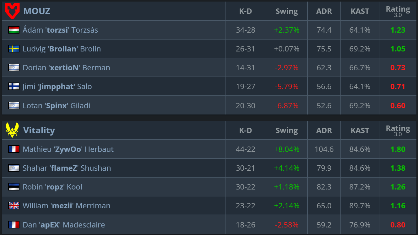 Vitality delivered a structured and pragmatic performance, effectively leveraging their firepower and decision-making edge. MOUZ displayed competitive stretches, particularly on Inferno, but ultimately failed to establish sustained control of the series.