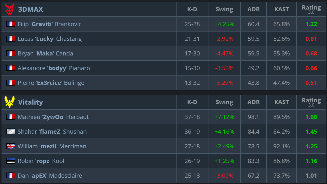 Vitality completely neutralized their opponent’s map choice. The French squad won the majority of opening duels, consistently broke 3DMAX’s economy, and prevented them from developing any attacking momentum. After the side switch, the map quickly came under full control of the favorites.