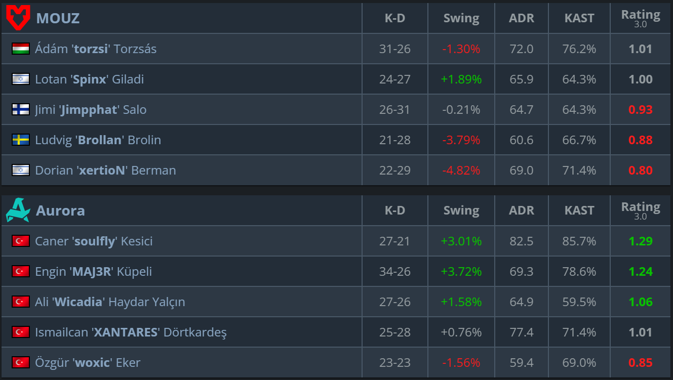 From the opening rounds, Aurora set a high tempo, won key duels, and forced MOUZ to play with a limited economy throughout the map. Strong map control allowed Aurora to calmly close out the game.