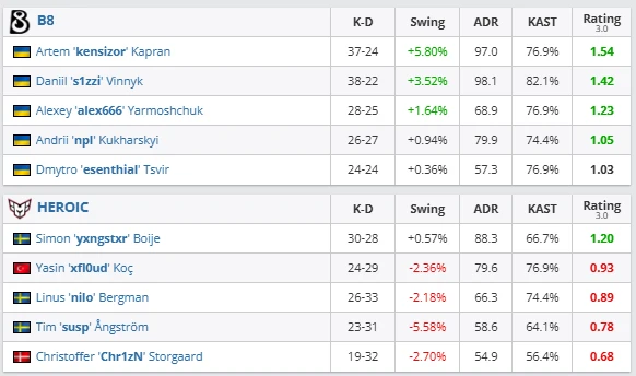 HEROIC’s pick started competitively, but B8 steadily gained control through well-timed rotations and mid-round adjustments. Artem “kensizor” Kapran and Daniil “s1zzi” Vinnyk consistently found opening duels, while alex666 and npl provided strong trading. HEROIC struggled to convert man advantages, and their economy never stabilized long enough to build momentum. B8 closed Nuke 13–9 without allowing late-round chaos.