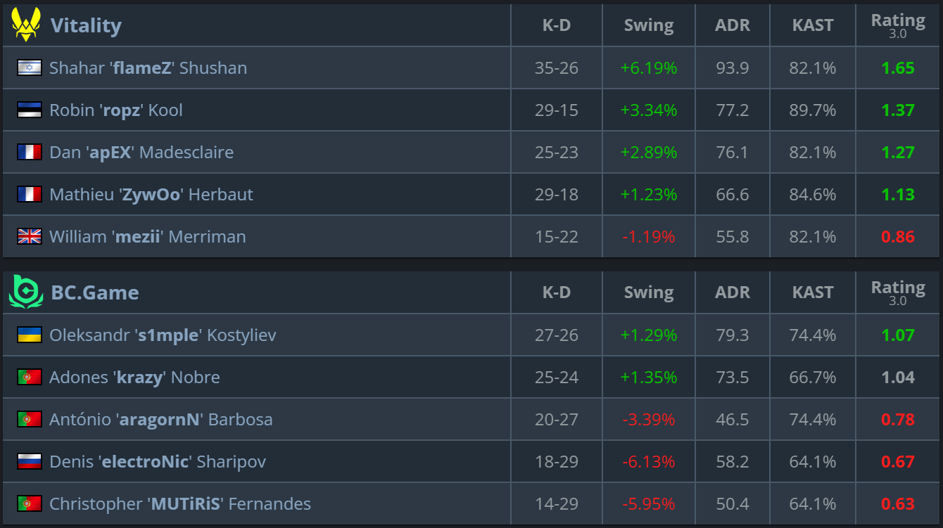 Vitality quickly dismantled the opponent’s plan on their own pick. The French squad consistently controlled the pace, not allowing BC.Game to impose an aggressive style. FlameZ and ropz regularly found opening frags, while ZywOo played intelligently in key rounds, gradually destroying the opponent’s economy. Despite a few successful rounds from s1mple, BC.Game were unable to maintain the rhythm of the map.