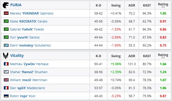 The series’ breaking point. Vitality dismantled FURIA from the opening rounds, racing to a lopsided half. ZywOo dictated the map entirely, while FURIA looked out of sync both tactically and mentally.
